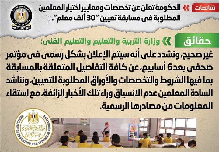تداولت بعض المواقع الإلكترونية وصفحات التواصل الاجتماعي أنباء بشأن إعلان الحكومة عن تخصصات ومعايير اختيار المعلمين المطلوبة في مسابقة تعيين "30 ألف معلم"، وقد قام المركز الإعلامي لمجلس الوزراء بالتواصل مع وزارة التربية والتعليم والتعليم الفني، والتي نفت تلك الأنباء، مُؤكدةً أنه لا صحة لإعلان الحكومة عن تخصصات ومعايير اختيار المعلمين المطلوبة في مسابقة تعيين "30 ألف معلم"، مُشددةً على أنه سيتم الإعلان بشكل رسمي في مؤتمر صحفي بعد 6 أسابيع، عن كافة التفاصيل المتعلقة بالمسابقة بما فيها الشروط والتخصصات والأوراق المطلوبة للتعيين، مُناشدةً السادة المعلمين عدم الانسياق وراء تلك الأخبار الزائفة، مع استقاء المعلومات من مصادرها الرسمية.