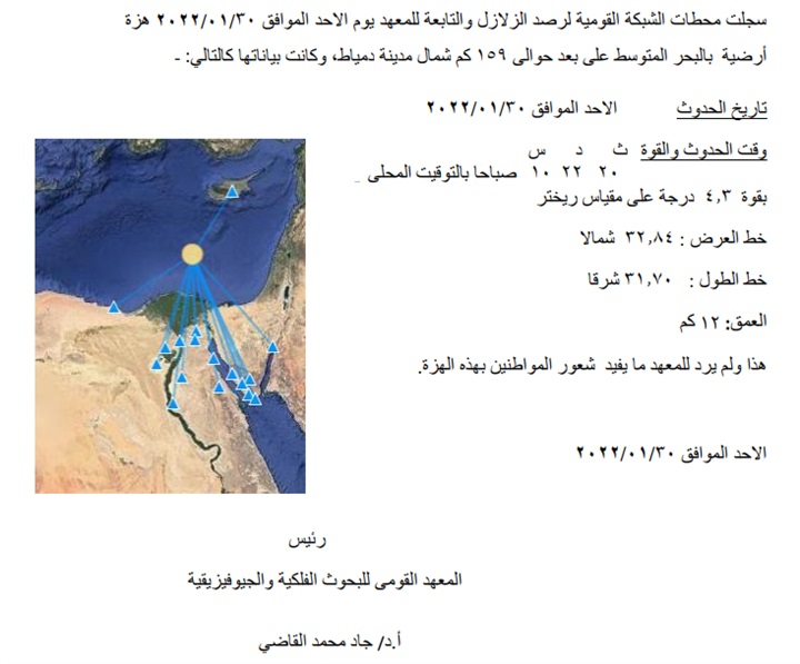 أعلن الدكتور جاد محمد القاضي رئیس المعهد القومي للبحوث الفلكية والجيوفيزيقية، أن محطات الشبكة القومية لرصد الزلازل والتابعة للمعهد سجلت اليوم الأحد الموافق ۲۰۲۲/۰۱/۳۰، هزة أرضية بالبحر المتوسط على بعد حوالي 159 كم شمال مدينة دمياط، وكانت بياناتها كالتالي: