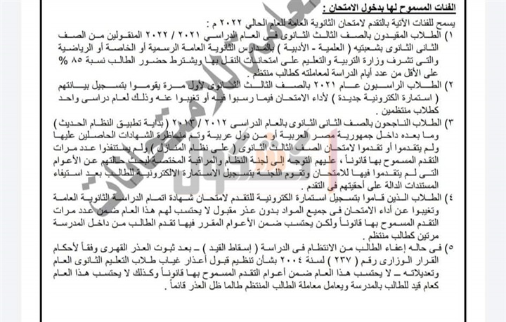 وجاءت الفئات المسموح لها أداء امتحانات الثانوية العامة للعام الدراسي الجاري كالتالي: