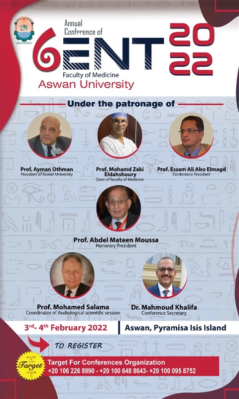 وذلك تحت رعاية الدكتور أيمن محمود عثمان رئيس جامعة أسوان، والدكتور محمد زكي الدهشوري عميد كلية الطب جامعة أسوان، والدكتور عصام أبو المجد الشريف رئيس قسم الأنف والأذن والحنجرة ورئيس المؤتمر، وبمشاركة العديد من الجامعات المصرية والأجنبية.