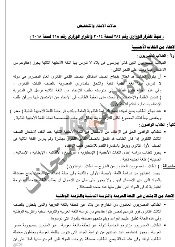ثانيا: الطلاب الوافدون، لهم الحق في الإعفاء من الامتحان في اللغة الاجنبية الاولى والثانية عند التقدم لامتحان الثالث الثانوي.