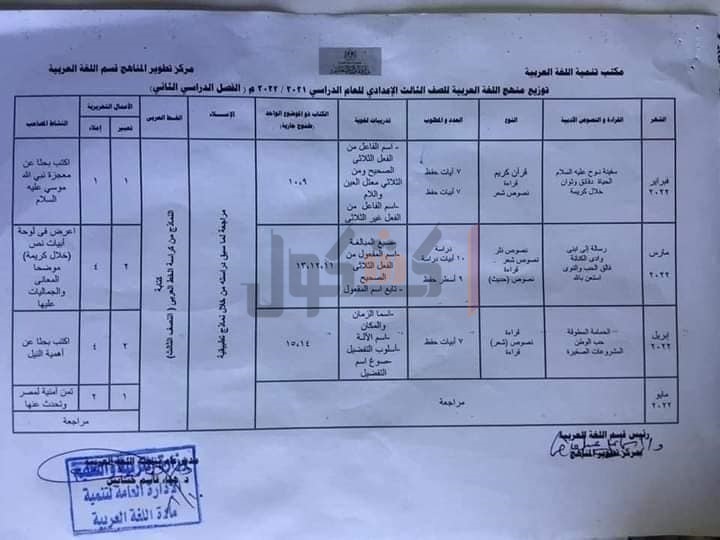 التربية والتعليم والتعليم الفني، توزيع منهج اللغة العربية للصف الثالث الإعدادي