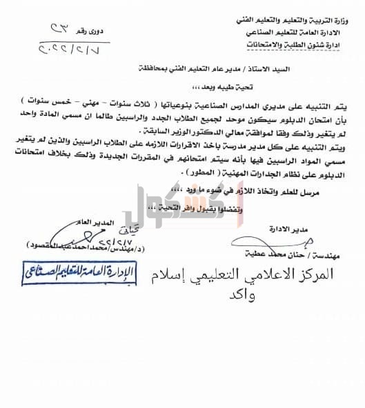 ووجهت الوزارة في خطابها، بضرورة التنبيه على مديري المدارس الصناعية نظام الثلاث سنوات والمهني والخمس سنوات، بأن امتحان الدبلوم سيكون موحد لجميع الطلاب الجدد والراسبين، طالما أن مسمي المادة الواحدة لم يتغير.