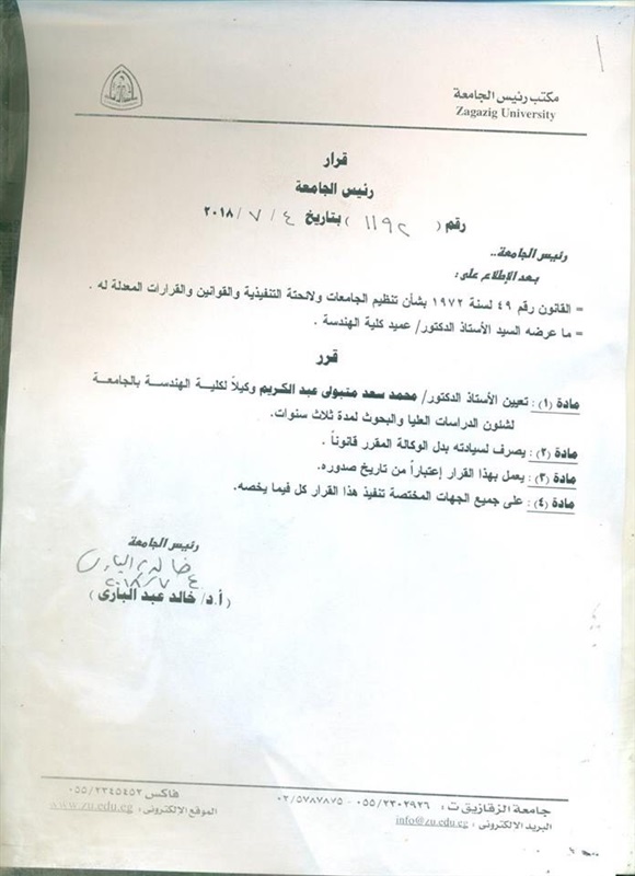 أصدر الدكتور خالد عبدالباري رئيس جامعة الزقازيق القرار رقم (1192) بتاريخ 4/7/2018، بتعيين الدكتور محمد سعد متبولي عبدالكريم وكيلا لكلية الهندسة بالجامعة لشئون الدراسات العليا والبحوث لمدة ثلاث سنوات.