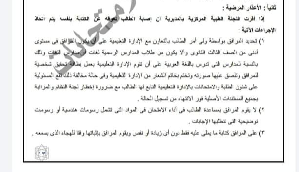 ۲) محظور حظرأ تاما السماح لأي طالب مريض بأداء الامتحان بلجنة خاصة في أي مستشفى عام ، فإذا كانت الحالة المرضية للطالب لا تمكنه من أداء الامتحان بلجنته فعليه تقديم المستندات الطبية للإدارة التعليمية التابع لها لترفعها بدورها للإدارة المركزية للتعليم الثانوى بالوزارة للنظر في الحالة المعروضة.