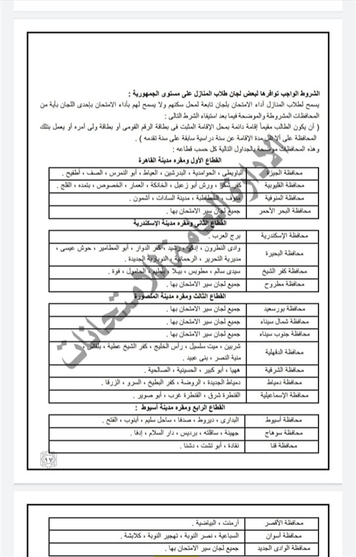 وأشارت التعليم، إلى أنه يجب على الطلاب المنازل أداء الامتحان بلجان تابعة لمحل سكنهم ولا يسمح لهم بأداء الامتحان بإحدى اللجان بأية من المحافظات المشروطة والموضحة فيما بعد استيفاء الشرط التالي: أن يكون الطالب مقيماً إقامة دائمة بمحل الإقامة المثبت في بطاقة الرقم القومي أو بطاقة ولى أمره أو يعمل بتلك المحافظة على ألا تقل مدة الإقامة عن سنة دراسية سابقة على سنة تقدمه.