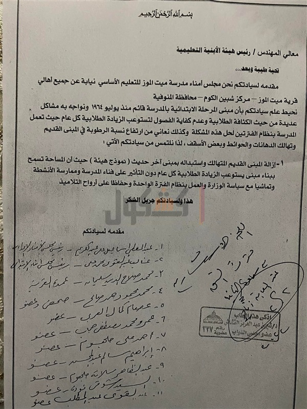 بشأن سوء حالة مدرسة ميت الموز للتعليم الأساسي