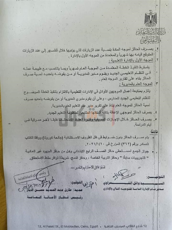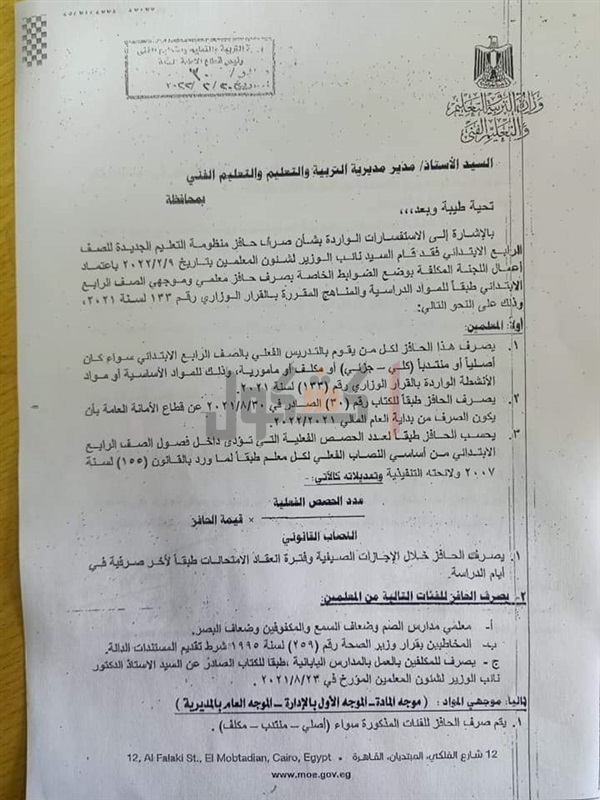 وزارة التربية والتعليم والتعليم الفني للمديريات التعليمية، بشأن صرف حافز منظومة