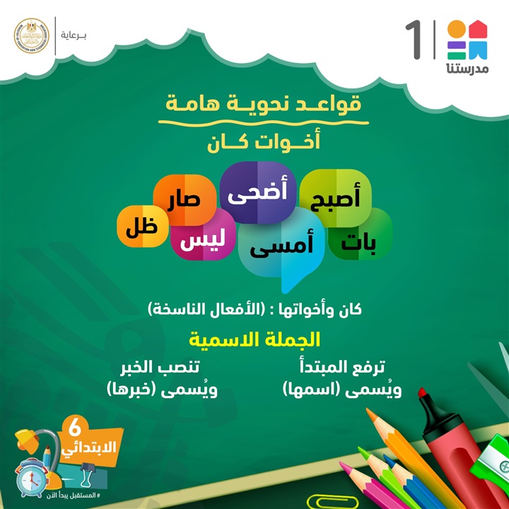 أعلنت قناة مدرستنا 1، للمرحلة الابتدائية لطلاب "الصف السادس الابتدائي"، مراجعة للقواعد النحوية لمادة اللغة العربية.