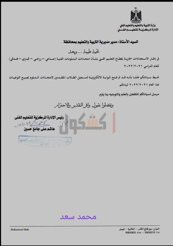 وقالت الوزارة في خطابها، إنه في إطار الاستعدادات الجارية بقطاع التعليم الفني بشأن امتحانات الدبلومات الفنية (صناعي، زراعي، تجاري، فندقي)، فقد تم فتح البوابة الإلكترونية لتسجيل الطلاب المتقدمين لامتحانات الدبلوم بجميع نوعياته للعام 2021/2022.