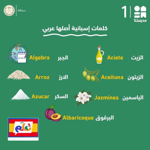 وطالبت القناة، قائله تعالوا طلابنا الأعزاء نتعرّف على أشهر مفردات اللغة الإسبانية من أصل عربى.. وشاركونا معرفتكم بأي كلمات آخرى ترجع أصولها للغة العربية.