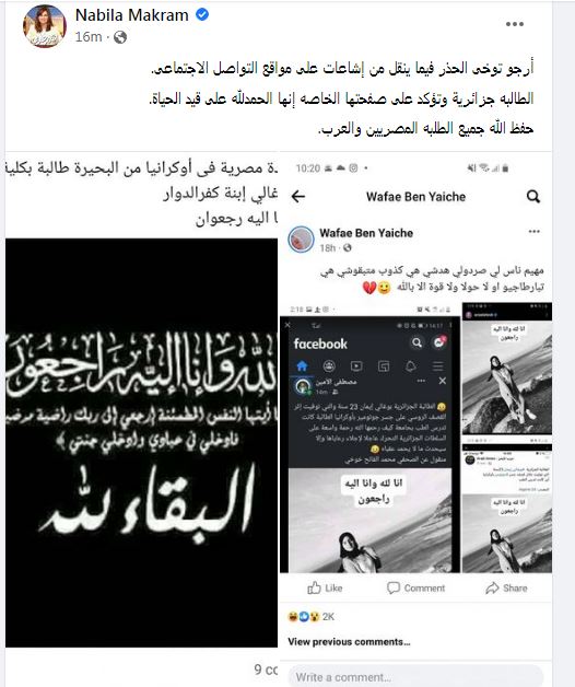 وتابعت: أرجو توخى الحذر فيما ينقل من إشاعات على مواقع التواصل الاجتماعى، الطالبه جزائرية وتؤكد على صفحتها الخاصه إنها الحمدلله على قيد الحياة، حفظ الله جميع الطلبه المصريين والعرب.