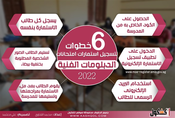 نرصد في الإنفوجراف التالي لطلاب الدبلومات 6 خطوات لتسجيل استمارات امتحانات الدبلومات الفنية 2022:
