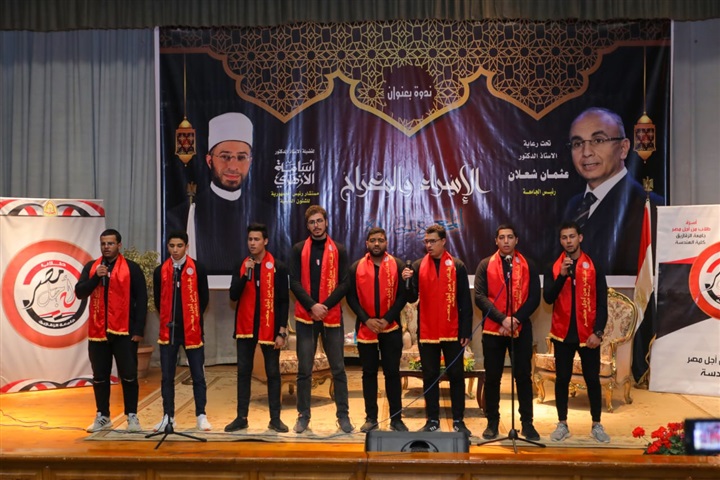 وقدم فقرات الحفل الدكتور سيد العباسي الأستاذ بكلية الطب وزميل كلية الدفاع الوطني بأكاديمية ناصر العسكرية، حيث بدأ الحفل بآيات من الذكر الحكيم، ثم فقرة من الأنشودات الدينية من أداء كورال الإنشاد الديني بالجامعة، في مدح الرسول صلاة الله وسلامه عليه، احتفاءاً بمعجزة الإسراء والمعراج، والتي لاقت استحسان جميع الحضور والإشاده بأدائهم المتميز .