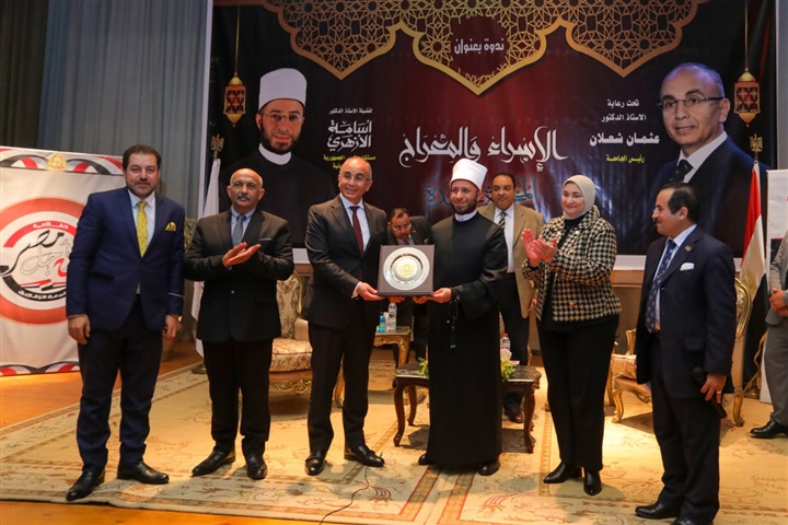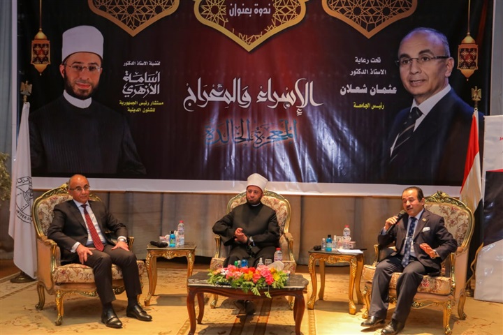 وخلال كلمته رحب الدكتور عثمان شعلان بالدكتور أسامه الأزهري، فى رحاب جامعة الزقازيق موجهاً له الشكر على مشاركته فى هذه الندوة الدينية التوعوية لتعريف الطلاب بالدروس المستفادة من ذكرى الإسراء والمعراج وفضائل هذه الليلة، وأهمية تنظيم مثل هذه الندوات التوعوية للطلاب لتجديد الخطاب الدينى وأهمية دور رجال الدين فى تعليم الأجيال أمور دينهم بطريقة معتدلة لحمايتهم من التطرف الدينى المتشدد.