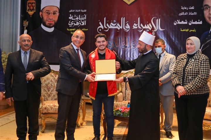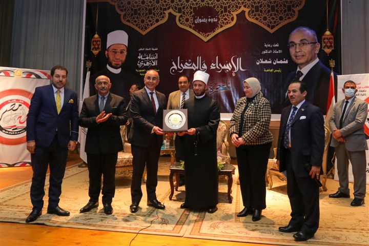وفي الختام قدم الدكتور رئيس الجامعة بإهداء الدكتور أسامة الأزهري درع الجامعة تقديراً لجهوده ودوره المتميز في زيادة الوعى والتوعية الدينية المستنيرة، وإهداء الطلاب من أعضاء فرقة كورال الإنشاد الديني شهادات التكريم.