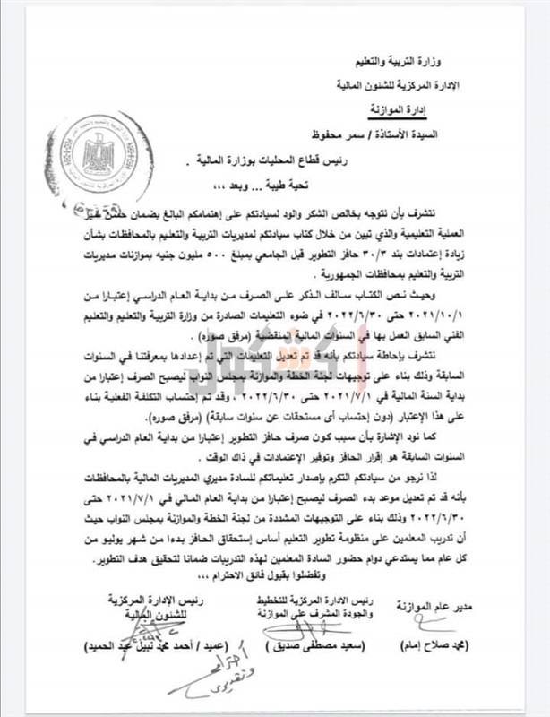خاطبت وزارة التربية والتعليم والتعليم الفني، وزارة المالية، بشأن اعتماد صرف حافز تطوير التعليم أعتبارا من ٢٠٢١/٧/١ وليس ٢٠٢١/١٠/١، بناءا على توجيهات لجنة الخطة والموازنة بمجلس النواب.