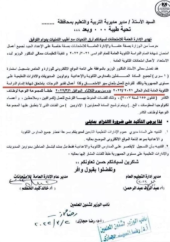 لوزارة التربية والتعليم والتعليم الفني، خطابا للمديريات التعليمية، بشأن تعليمات