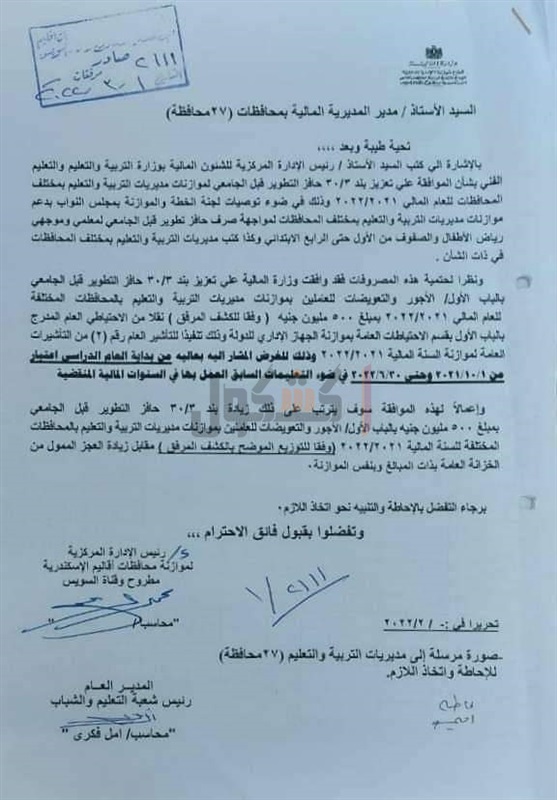 وجهت وزارة المالية خطاب رسمي للمديريات المالية بـ27 محافظة، بشأن الموافقة على تعزيز بند 3/30 حافز التطوير قبل الجامعي لموازنات مديريات التربية والتعليم بمختلف المحافظات للعام المالي 2021/2022.