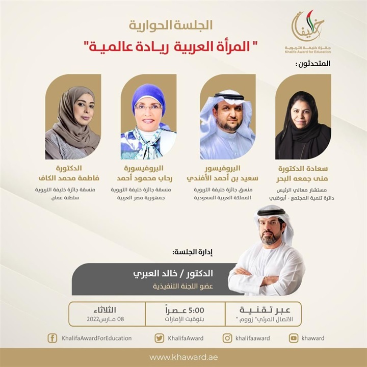 أعلنت الأمانة العامة لجائزة خليفة التربوية بدولة الإمارات العربية المتحدة عن تنظيم جلسة حوارية ضمن أنشطتها، بعنوان "المرأة العربية ريادة عالمية" والتي تواكب احتفالات العالم باليوم العالمي للمرأة في شهر مارس من كل عام.