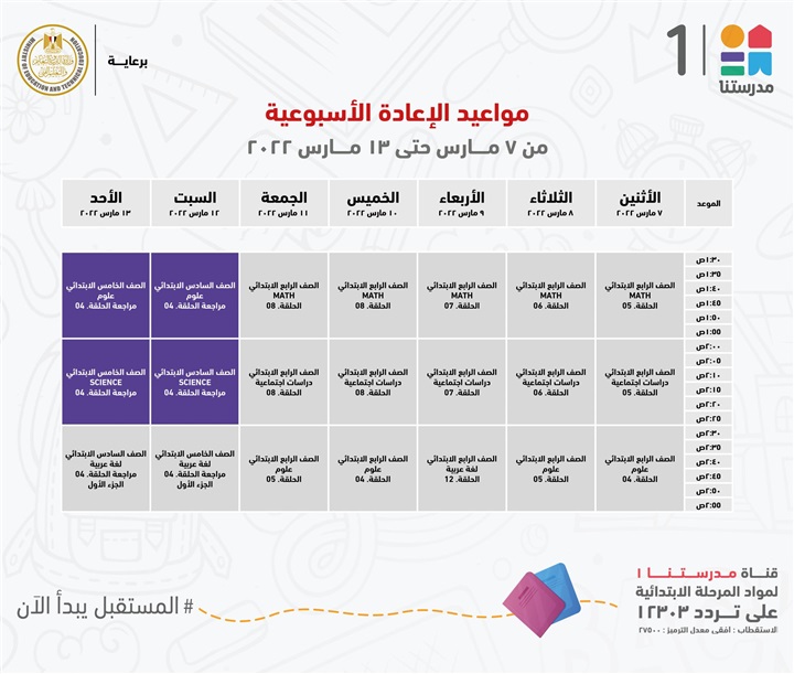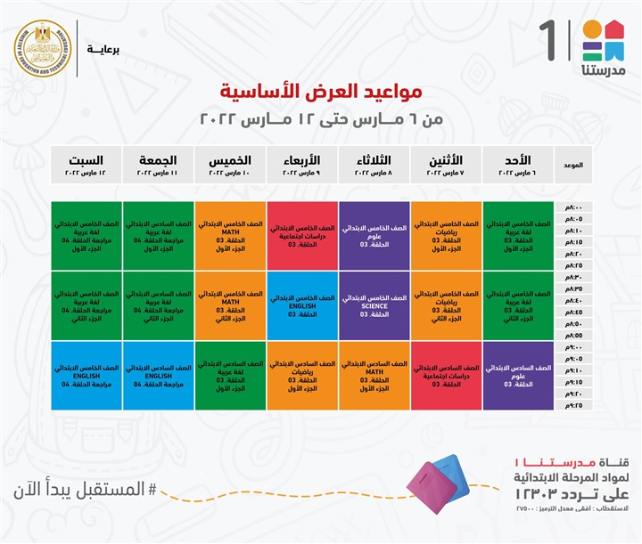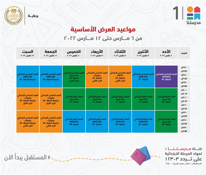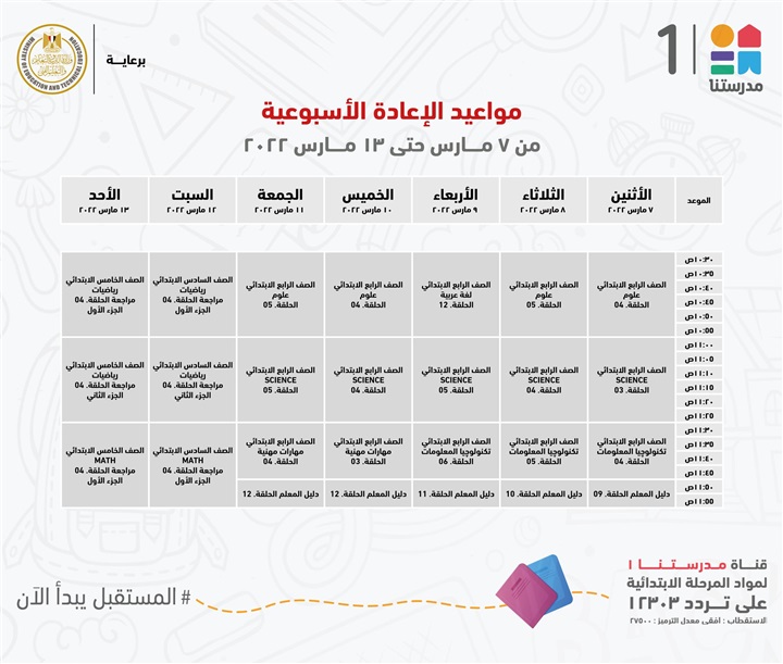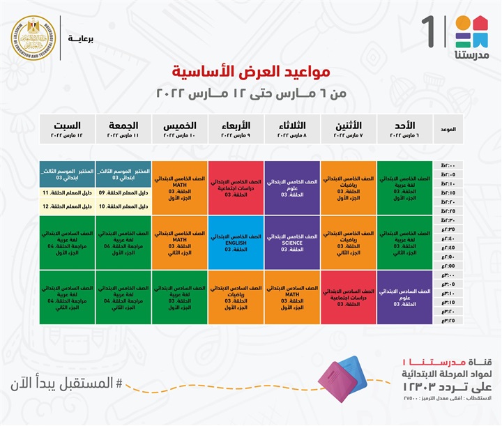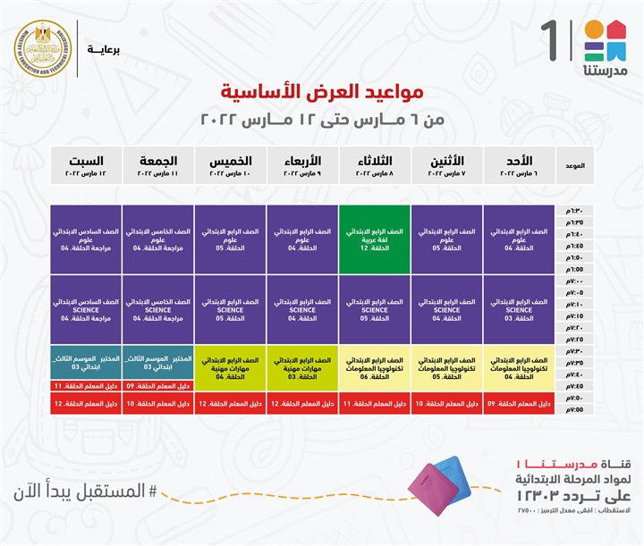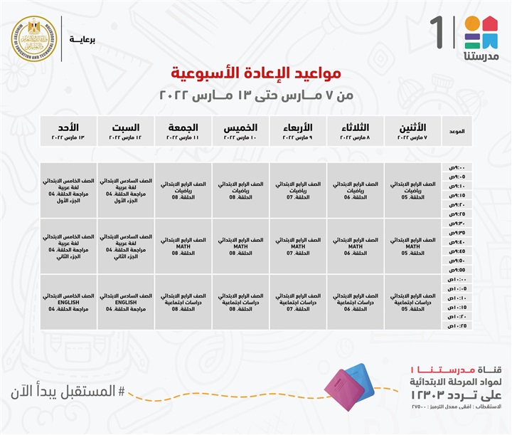 "مدرستنا 1" الأعزاء، إليكم مواعيد عرض البرامج التعليمية للصفوف الابتدائية،