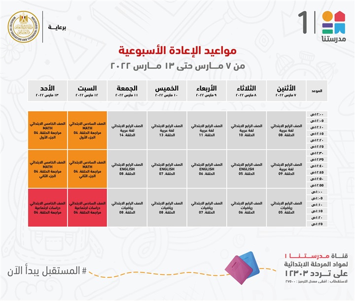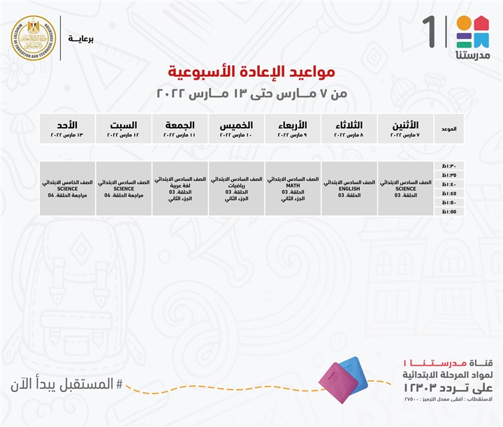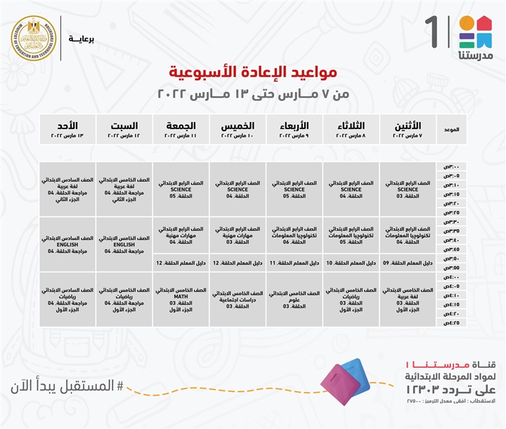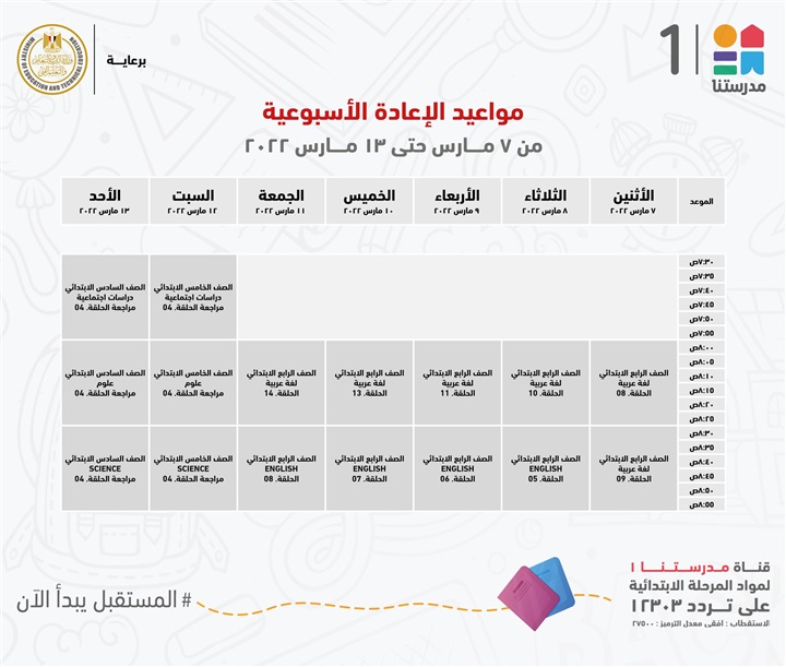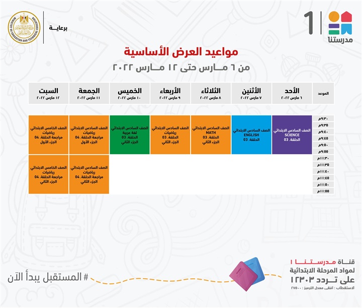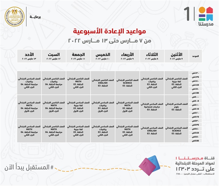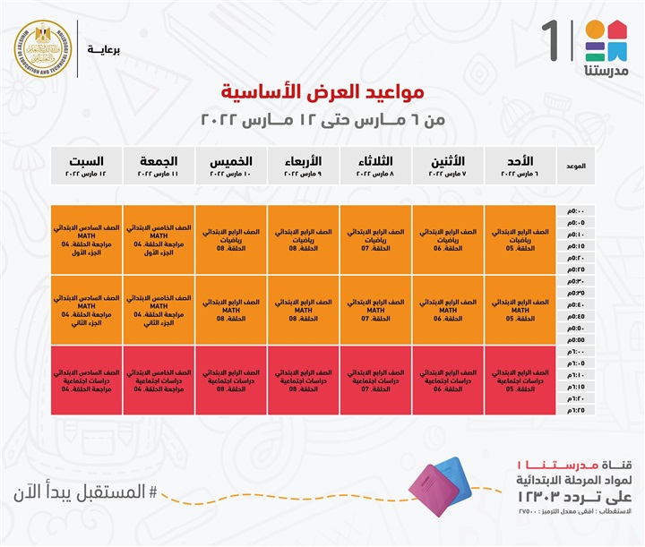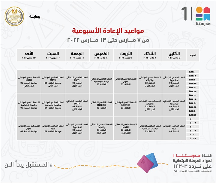"مدرستنا 1" الأعزاء، إليكم مواعيد عرض البرامج التعليمية للصفوف الابتدائية،