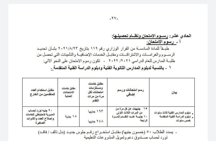 رسوم امتحانات الدبلومات الفنية للعام الدراسي الحالي ٢٠٢١/ ٢٠٢٢م .