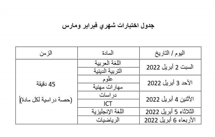 ونص الكتاب الدوري على دمج اختبارات شهري فبراير ومارس باختبار واحد فقط، في الفترة من 2 إلى 6 أبريل 2022 طبقًا للجدول المرفق بالبيان، على أن تقتصر الأسئلة على خطة توزيع المنهج المقرر حتى نهاية شهر مارس، وتوضع الأسئلة عن طريق موجهي المواد الدراسية بالإدارة التعليمية - من بنك الأسئلة- ولكل مدرسة امتحان منفصل.
