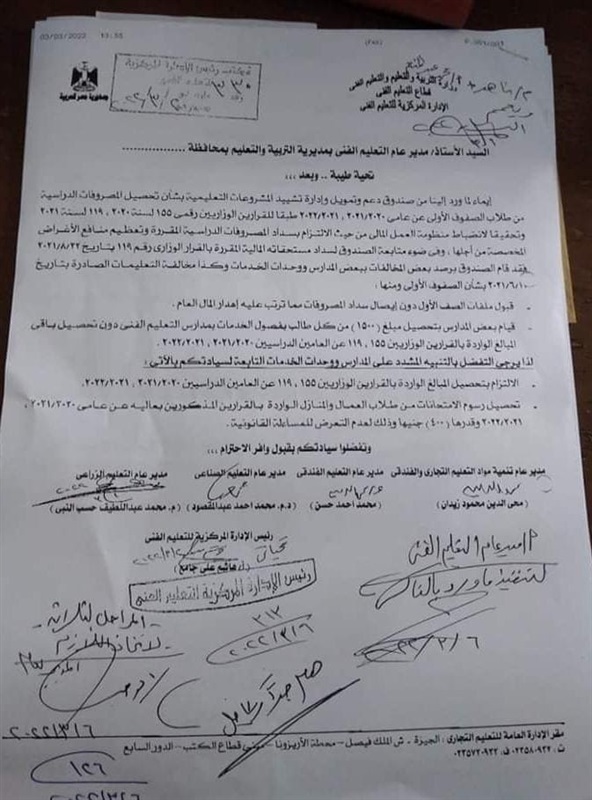 الفني، خطابا هاما، بشأن تحصيل المصروفات الدراسية من طلاب الصفوف الأولى عن عامی ۲۰۲۱/۲۰۲۰ ، ۲۰۲۲/۲۰۲۱.