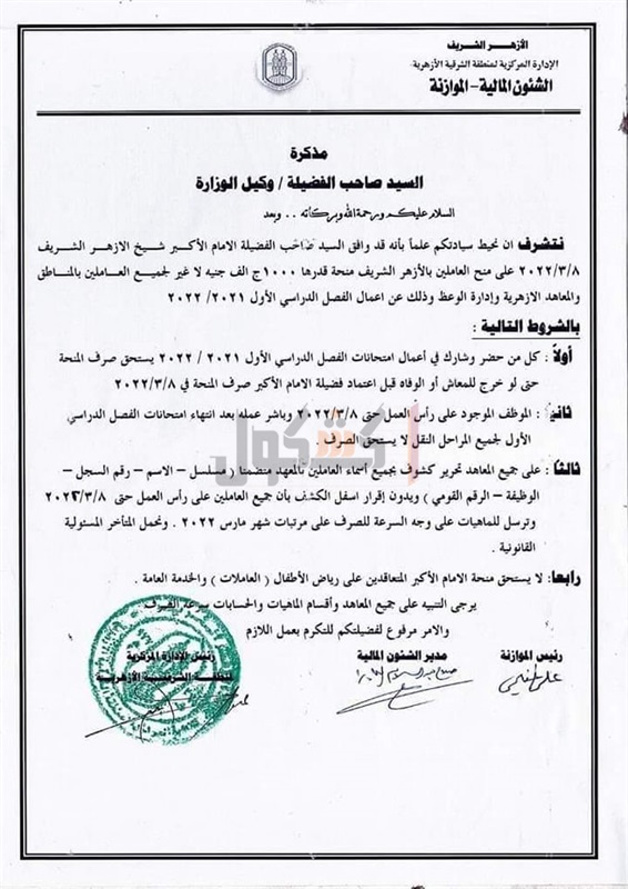 رابعا: لا يستحق منحة الامام الأكبر المتعاقدين على رياض الأطفال (العاملات) والخدمة العامة. يرجى التنبيه على جميع المعاهد وأقسام الماهيات والحسابات سرعة الصرف.