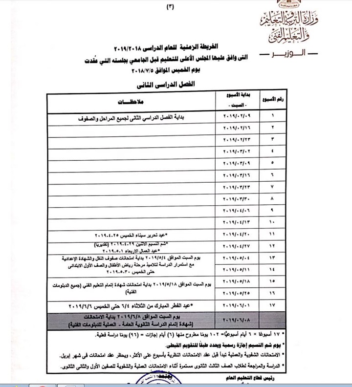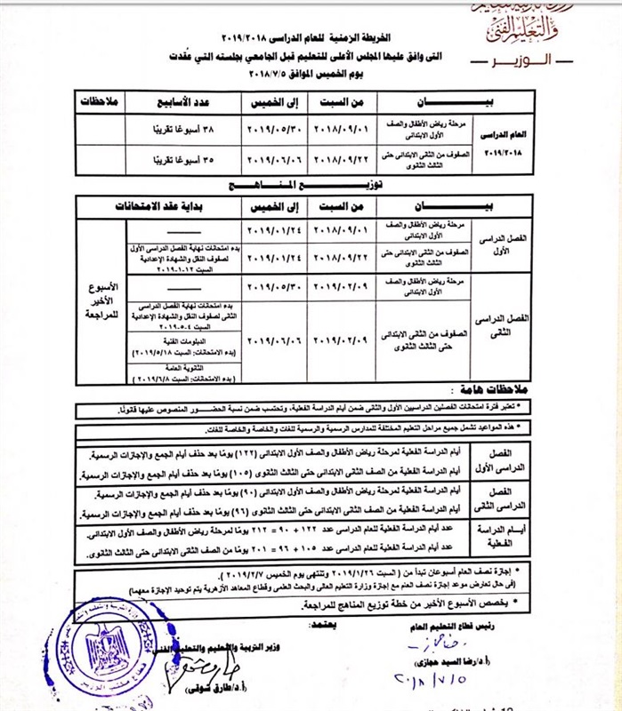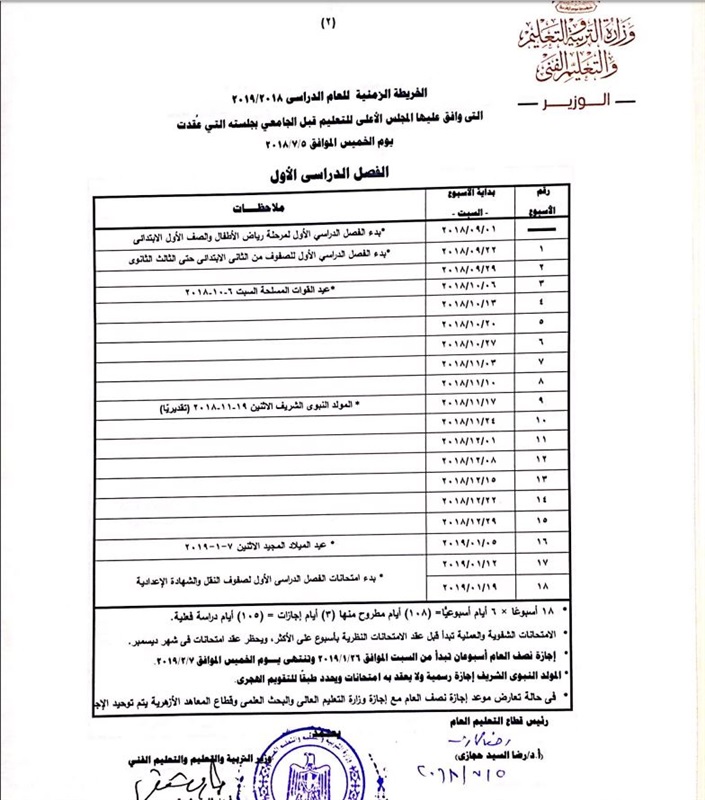 وافق المجلس الأعلى للتعليم قبل الجامعي علي الخريطة الزمنية للعام الدراسي 2019/2018، والتي تبدأ في 2018/9/1 إلي 2019/5/30 بعدد 38 أسبوع تقريبًا لمرحلة رياض الأطفال والصف الأول الابتدائي، وذلك لإتاحة الوقت لتدريس المناهج الجديدة، أما بالنسبة للصفوف بداية من الصف الثانى الابتدائي حتى الصف الثالث الثانوي تبدأ من 22/9/2018 إلى 6/6/2019 بعدد 35 أسبوع تقريبًا، وأجازة نصف العام أسبوعان تبدأ من السبت 26/1/2019 وتنتهى يوم الخميس 7/2/2019، وتعتبر فترة امتحانات الفصلين الدراسيين الأول والثانى ضمن أيام الدراسة الفعلية، وتحتسب ضمن نسبة الحضور المنصوص عليها قانونًا، وهذه القواعد تشمل جميع مراحل التعليم المختلفة، للمدارس الرسمية، والرسمية للغات، والخاصة، والخاصة للغات.