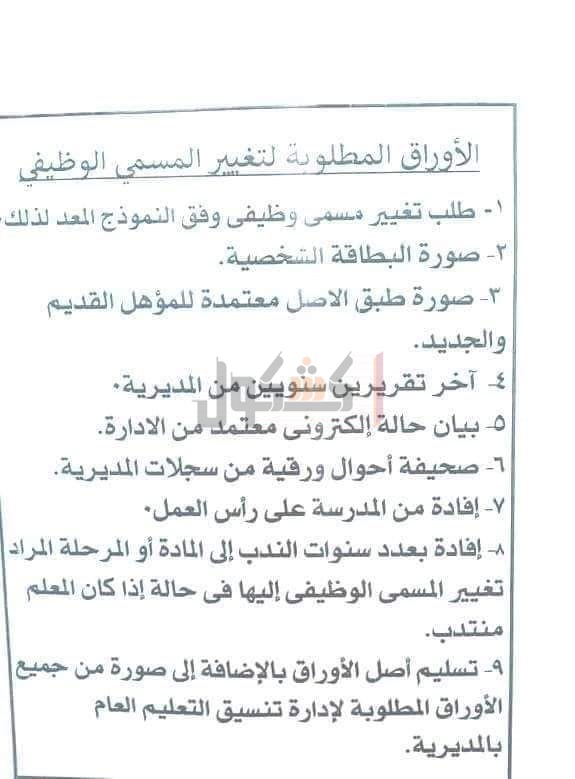 ٥- في حالة تغيير المسمي الوظيفي من مادة لمادة أخري يتم احضار صورة طبق الأصل من المؤهل القديم والمؤهل الحديث .