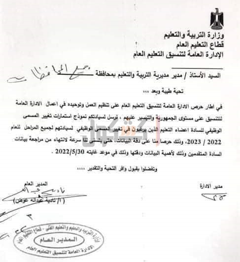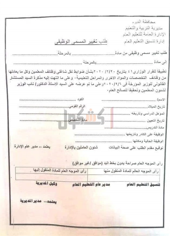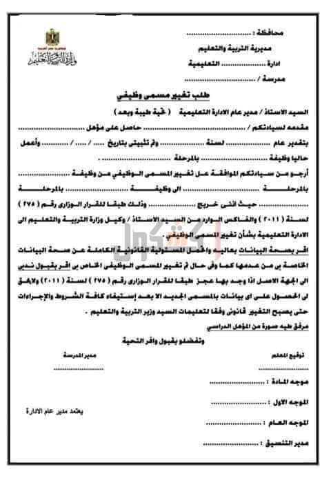 وجهت وزارة التربية والتعليم والتعليم الفني، المعلنين راغبي تغيير المسمى الوظيفي بتجهيز الأوراق الآتية: