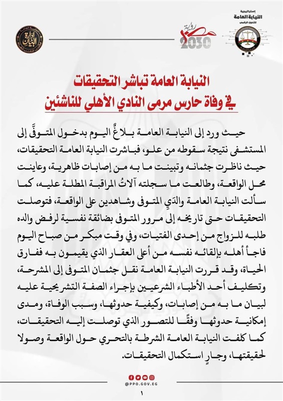 تباشر النيابة العامة التحقيقات، في حادث وفاة زياد إيهاب، حارس مرمى النادي الأهلي للشباب مواليد 2003، حيث ورد إلى النيابة العامة بلاغ اليوم بدخول المتوفَّى إلى المستشفى نتيجة سقوطه من علو.
