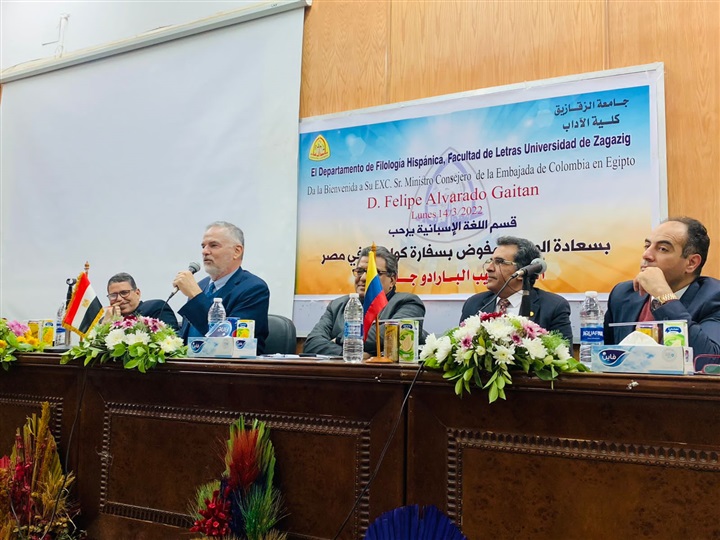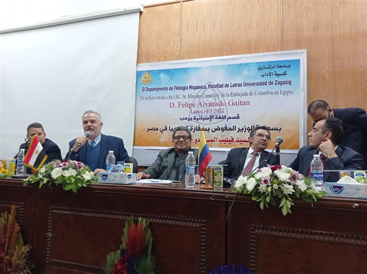 استقبلت كلية الآداب بجامعة الزقازيق، صباح اليوم، الوزير المفوض بسفارة دولة كولمبيا في مصر فيليب البارادو جايتان، وذلك تحت رعاية الدكتور عثمان شعلان رئيس جامعة الزقازيق، وبحضور الدكتور عماد مخيمر عميد كلية الآداب، والدكتور أسامه عبدالباري وكيل الكلية للدراسات العليا والبحوث والقائم بعمل وكيل الكلية لشئون التعليم والطلاب، والدكتور عبده كساب وكيل الكلية لشئون خدمة المجتمع وتنمية البيئة، والدكتور فهد عبدالعزيز رئيس قسم اللغة الأسبانية، والدكتور وائل سلامة مدير عام الكلية، ولفيف من أعضاء هيئة التدريس والهيئة المعاونة وعدد كبير من طلاب قسم اللغه الأسبانية.