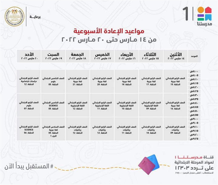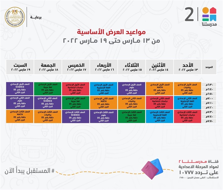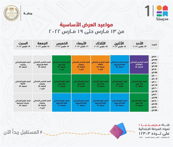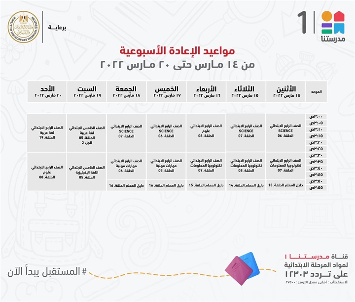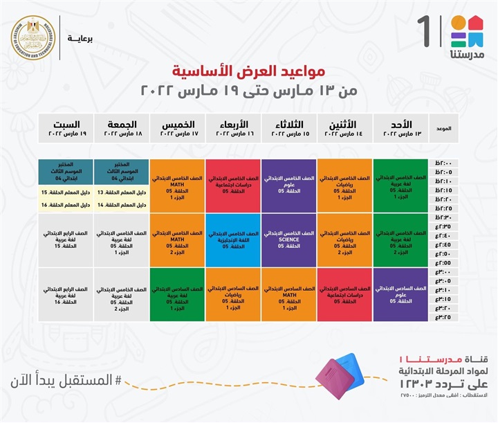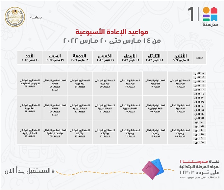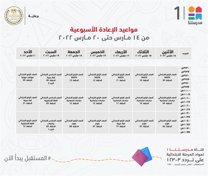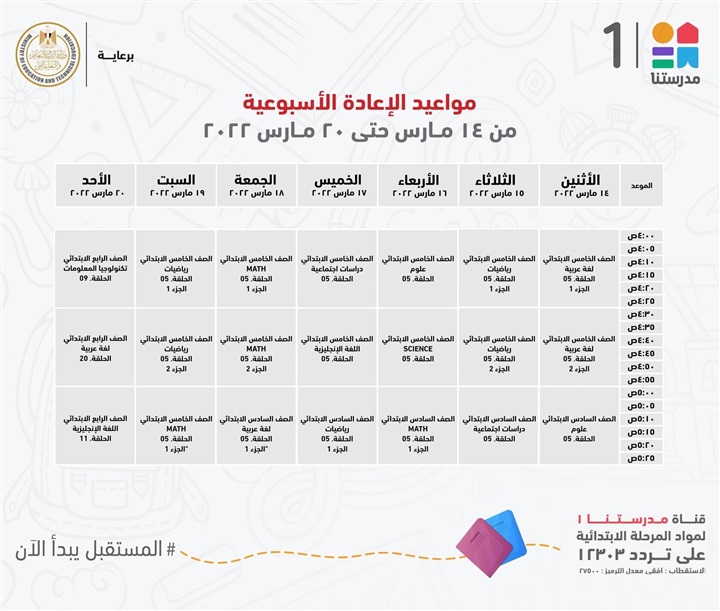أعلن قطاع المعاهد الأزهرية، مواعيد عرض البرامج التعليمية للمناهج المدرسية على قناة مدرستنا 1،2، حتى ٢٠ مارس الجاري، بالإضافة إلى مواعيد الإعادة.