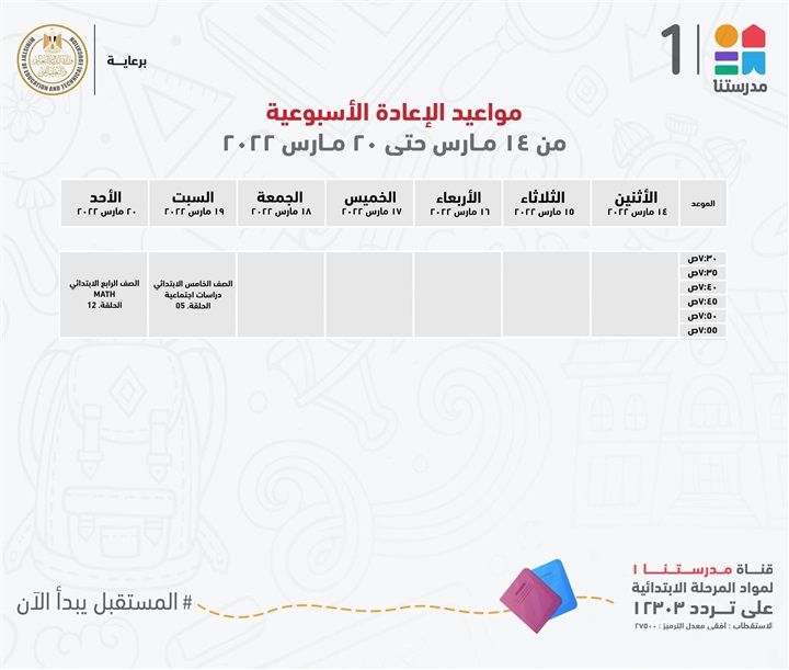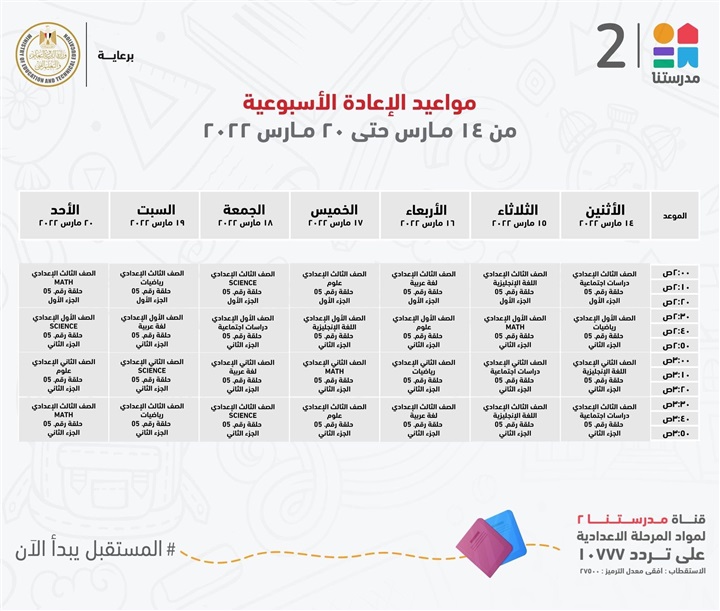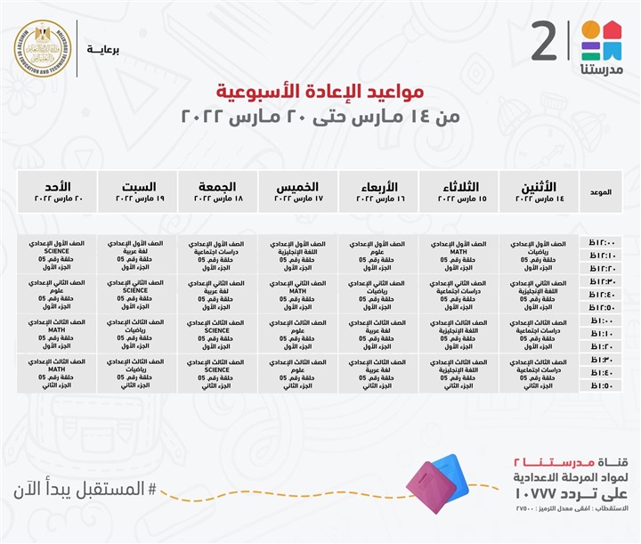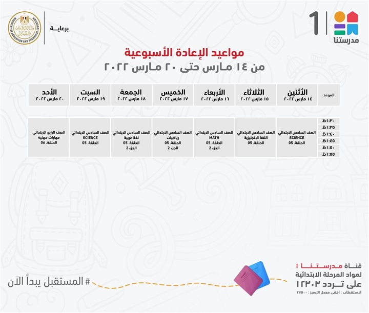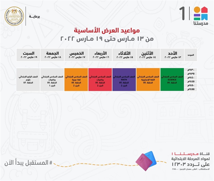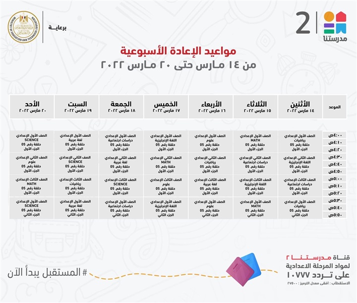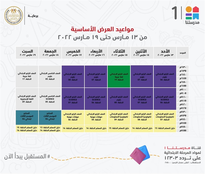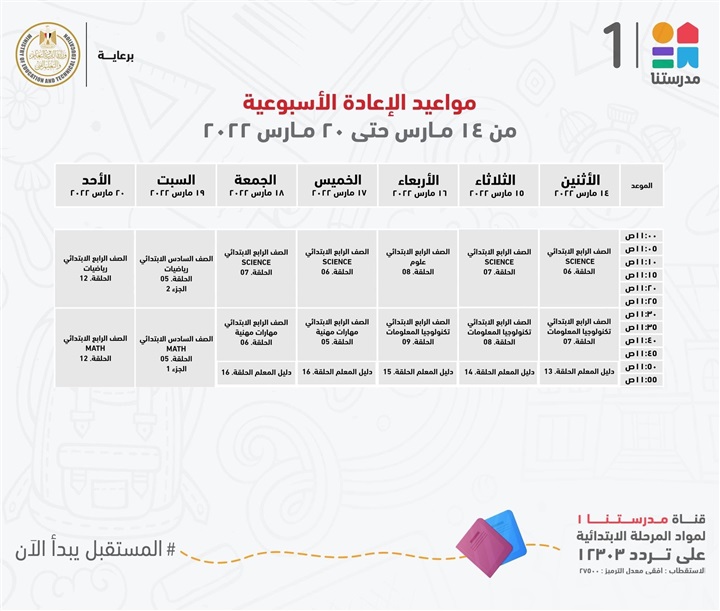 أعلن قطاع المعاهد الأزهرية، مواعيد عرض البرامج التعليمية للمناهج المدرسية على قناة مدرستنا 1،2، حتى ٢٠ مارس الجاري، بالإضافة إلى مواعيد الإعادة.