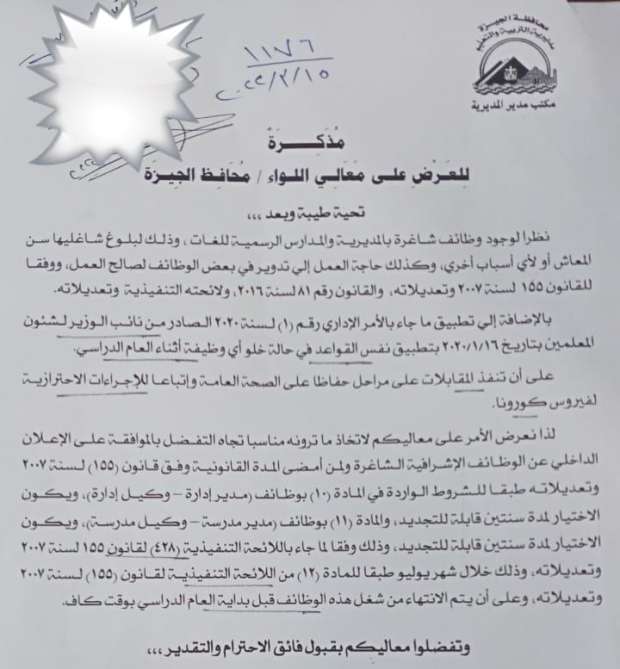 وأوضحت في خطاب للإدارات التعليمية، أن المقابلات تنفذ على مراحل، حفاظا على الصحة العامة، وإتباعا للإجراءات الاحترازية لفيروس كورونا، مؤكدة أن الوظائف الإشرافية الشاغرة ولمن أمضى المدة القانونية وفق قانون 155 لسنة 2007 وتعديلاته طبقاً للشروط الواردة في المادة 10 بوظائف كل من مدير إدارة ووكل إدارة ويكون الاختيار لمدة عامين قابلة للتجديد.