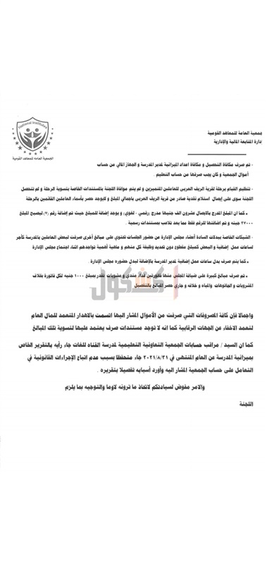 _ التحفظ على كافة المعاملات على الحساب الذي تم فتحه بالبنوك تحت مسمى حساب الجمعية لعدم اتباع الاجراءات الرقابية حسبما تنص القوانين ذات الصلة وقد تم التحفظ على كافة المستندات المتعلقة بذلك الحساب بواسطة الجمعية العامة للمعاهد القومية، وتم الإطلاع على تلك المستندات وقد بلغت مصروفات ذلك الحساب مبلغ 1494801 جنيها مصريا عن العام المالي المنتهي في 31/8/2022 بخلاف اي مصاريف عن العام الماضي.
