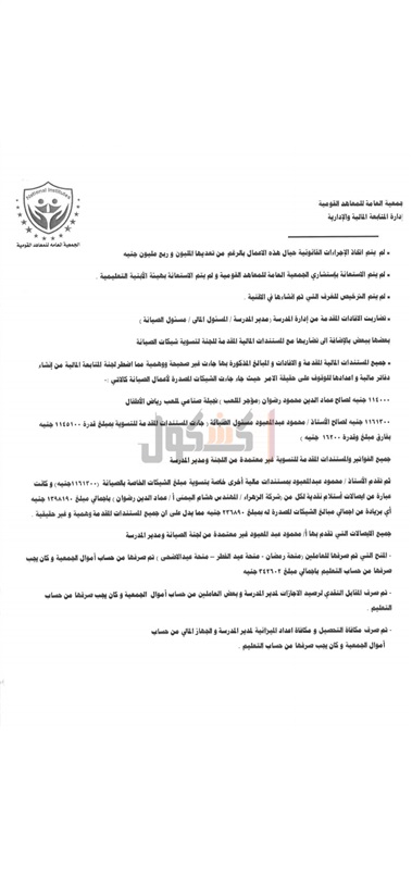كشف تقرير مراقب الحسابات بمدرسة القناة القومية بالمعادي، التي تقرر استبعاد القائم بأعمال المدير شريف العادلي على خلفية مخالفات مالية تصل ل3 ملايين جنية ورفضه لتنفيذ قرار نقله وتحريضه لأولياء الامور على تعطيل الدراسة.
