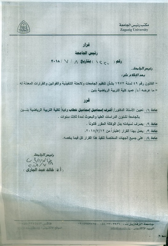 أصدر الدكتور خالد عبدالباري رئيس جامعة الزقازيق القرار رقم (1220) بتاريخ 8/7/ 2018 بتعيين الدكتور أشرف إسماعيل إسماعيل خطاب وكيلا لكلية التربية الرياضية بنين لشئون الدراسات العليا والبحوث لمدة ثلاث سنوات.