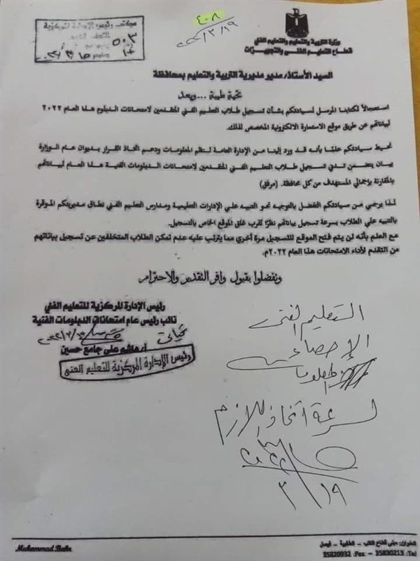 وشدد الخطاب على المديريات التعليمية، بأنه لن يتم فتح الموقع للتسجيل استمارة الدبلومات الفنية للعام الدراسي الحالي 2021/2022 مرة أخرى، مما يترتب عليه عدم تمكين المتخلفين عن تسجيل بيانتهم من التقدم لأداء الامتحانات هذا العام 2022م.