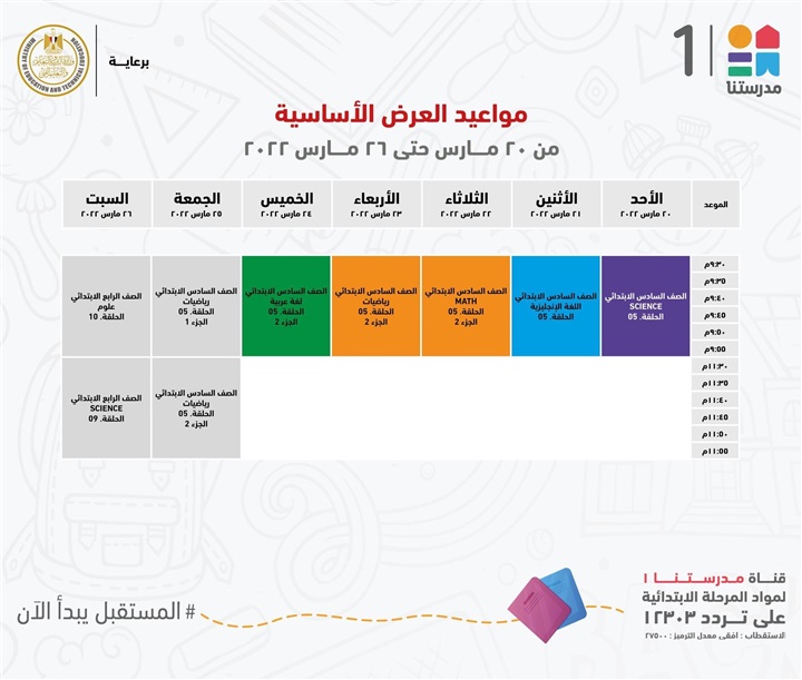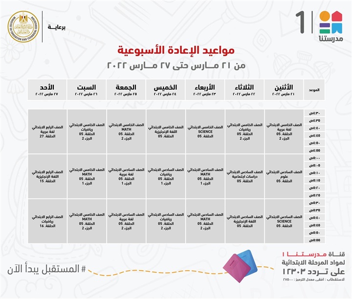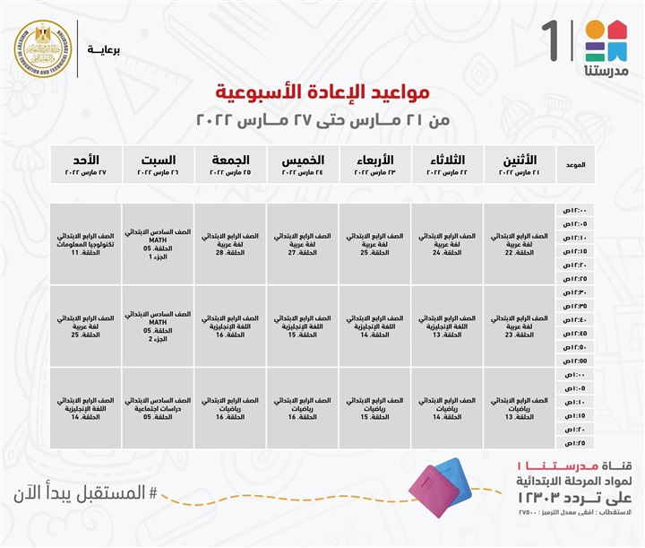 على القناة التعليمية مدرستنا 1 و2 للفترة من 20 مارس حتى 27 مارس الجاري بالإضافة