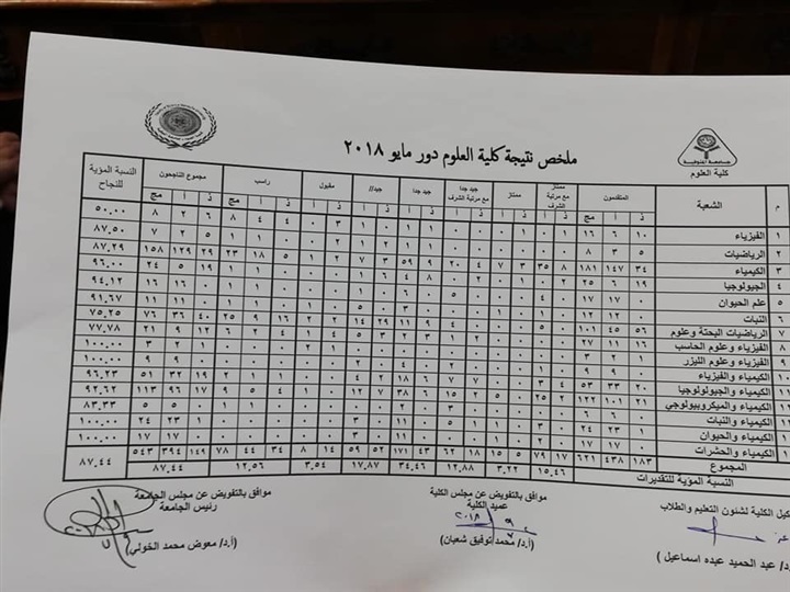 وأعلن الدكتور محمد توفيق عميد الكلية، أن نسبة النجاح بقسم الرياضيات 87.50% وقسم الفيزياء 50% والكيمياء 87.29% والجيولوجيا 96% وعلم الحيوان 94.12% والنبات 91.67% والرياضيات البحتة 75.25% والفيزياء وعلوم الحاسب 77.78% الكيمياء والجيولوجيا 96.23% الكيمياء والميكروبيولوجى 92.62% الكيمياء والنبات 83.33%، وبلغت نسبة النجاح 100% بأقسام: الفيزياء وعلوم الليزر، الكيمياء والفيزياء، الكيمياء والحيوان، الكيمياء والحشرات.