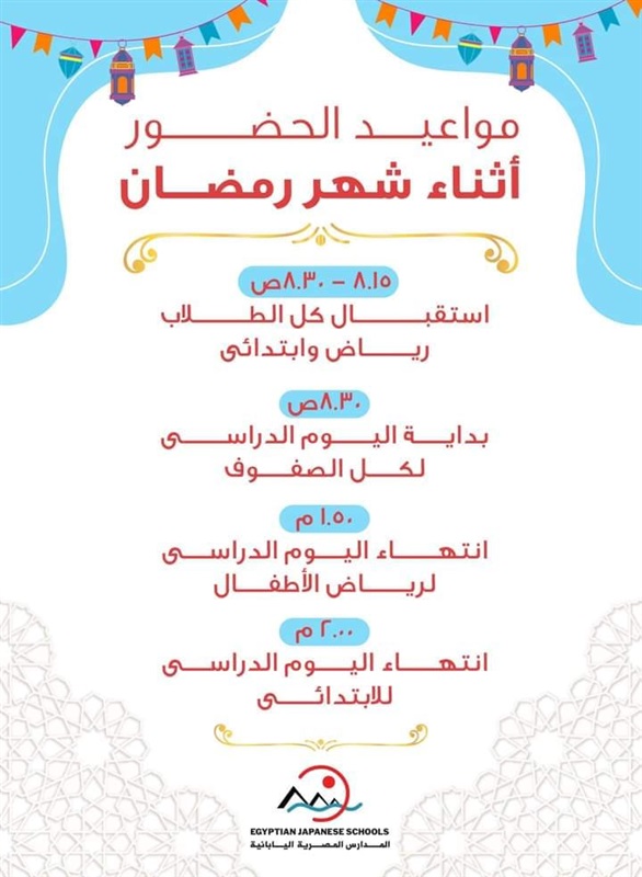 المصرية اليابانية، أن مواعيد الدراسة في رمضان كالتالي: