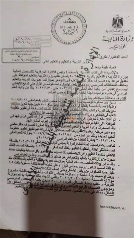 أصدرت وزارة المالية خطاب رسمي، وجهته للدكتور طارق شوقي وزير التربية والتعليم والتعليم الفني، بشأن تعديل موعد صرف حافز تطوير التعليم ما قبل الجامعي بموازنات التربية والتعليم بمختلف المحافظات لمعلمي وموجهي رياض الأطفال والصفوف حتى الرابع الابتدائي ليصبح اعتبارا من بداية العام المالي 1/1/2021 حتى 30/6/2022.