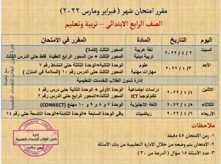 امتحانات الصف الرابع الابتدائي لشهري فبراير ومارس: