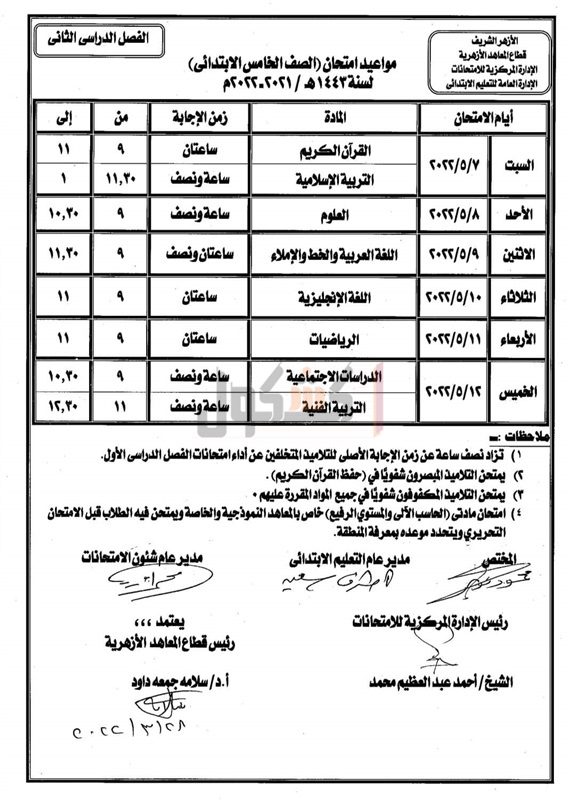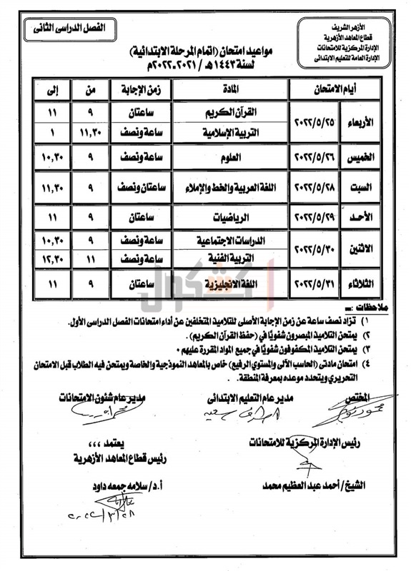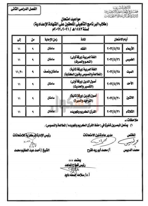 أعلن قطاع المعاهد الأزهرية جدول امتحانات الشهادتين الابتدائية والإعدادية بجانب جداول امتحانات صفوف النقل الابتدائى والإعدادى والثانوى، لامتحانات الفصل الدراسى الثاني، حيث تنطلق امتحانات الشهادة الابتدائية يوم 25 مايو القادم وتنتهي يوم 31 مايو .