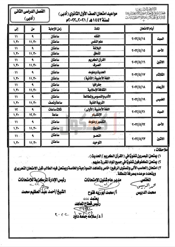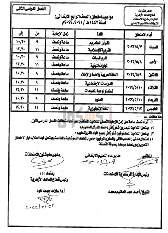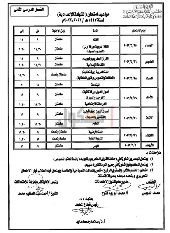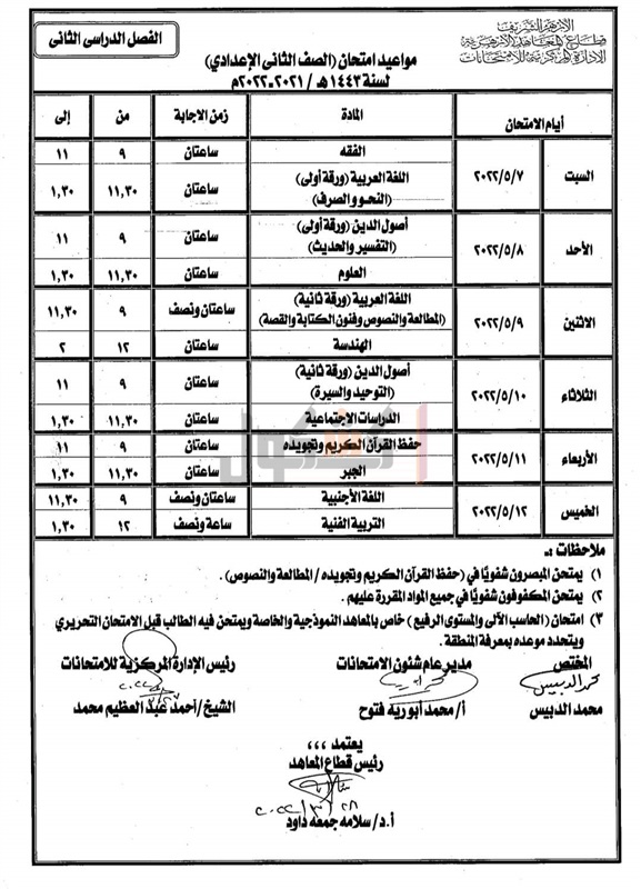 كما تنتطلق امتحانات الشهادة الإعدادية يوم 25 مايو وتنتهى يوم 1 يونيو، أما امتحان الصفين الرابع والخامس الابتدائى والأول والثانى الإعدادى فتنطلق يوم 7 مايو وتنتهى يوم 12 من نفس الشهر.
