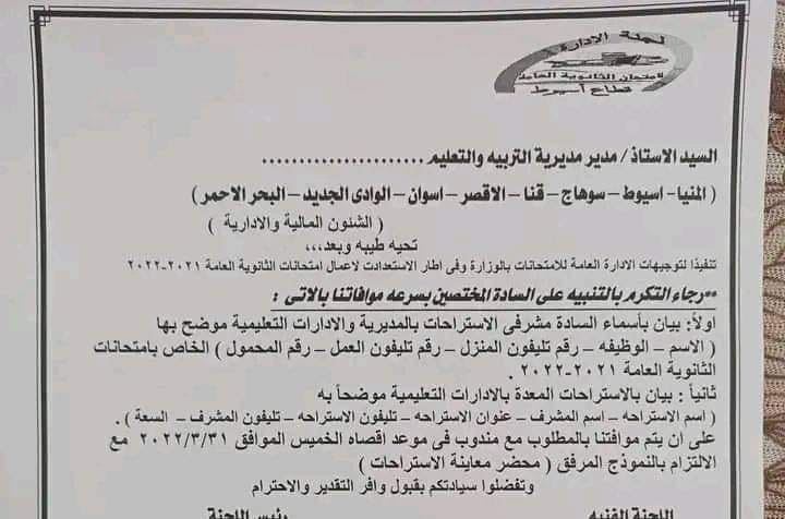 بالوزارة وفي إطار الاستعدادات لأعمال امتحانات الثانوية العامة ٢٠٢١-۲ ۲۰۲، يجب التنبيه على المختصين بسرعه موافاتنا بالاتى: